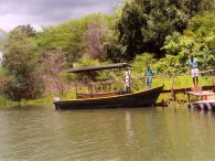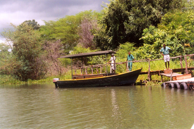 Boat with roof that we boarded on the Shire River at Mvuu Lodge, Liwonde National Park in Lilongwe, Africa, for a water safari.